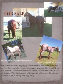 AQHA-Colonel Freckles mare. Bred twice and has foaled what she was bred to, roan and palomino. She has been trail ridden only. Very nice hip and an excellent brood mare. Easy to handle and load. Reduced to 500.00 with a breeding to my Impressive stallion-TQ Kid Fancy. Delivery can be arranged depending on distance.